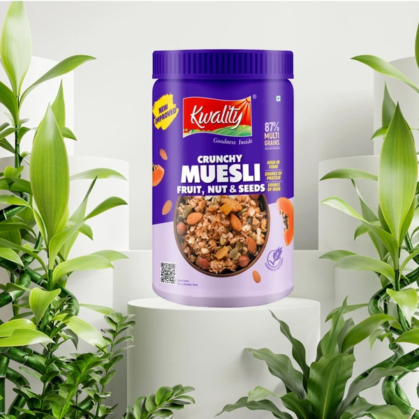 Kwality Crunchy Muesli Fruit & Nut, 76% Multigrains, High in Fibre & Protein, Breakfast Jar